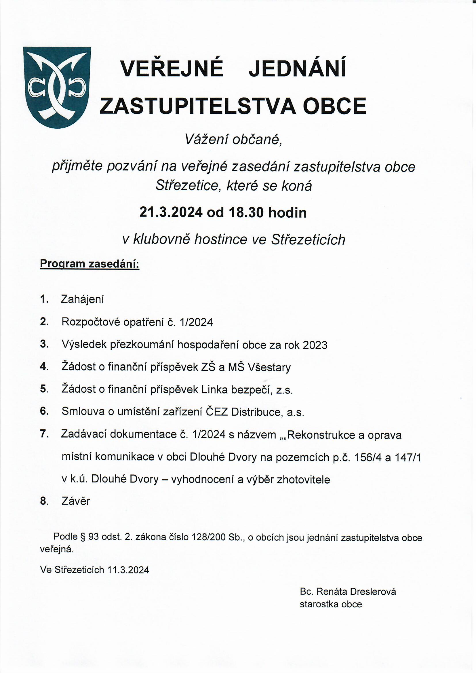 Pozvánka na veřejné jednání obce Střezetice dne 21.3.2024
